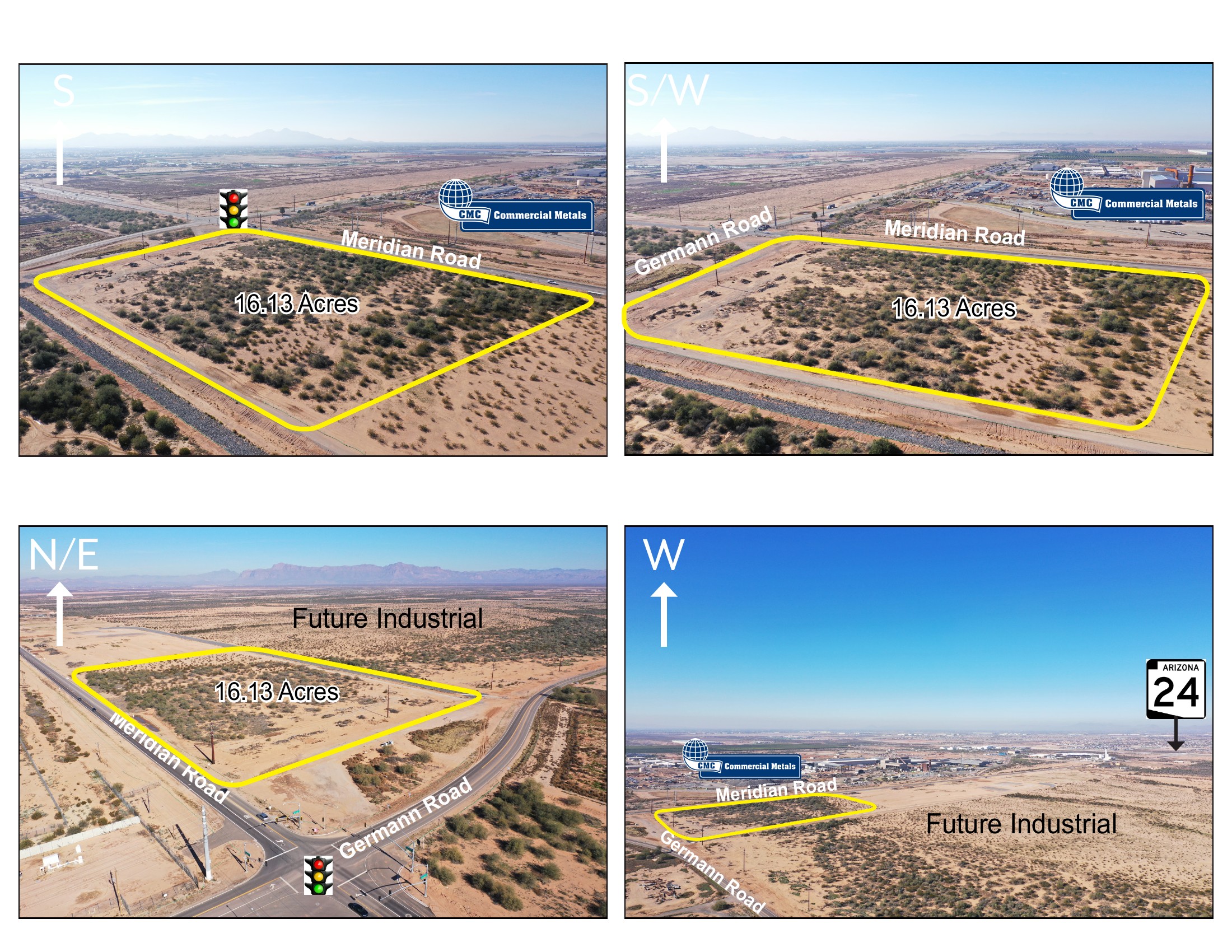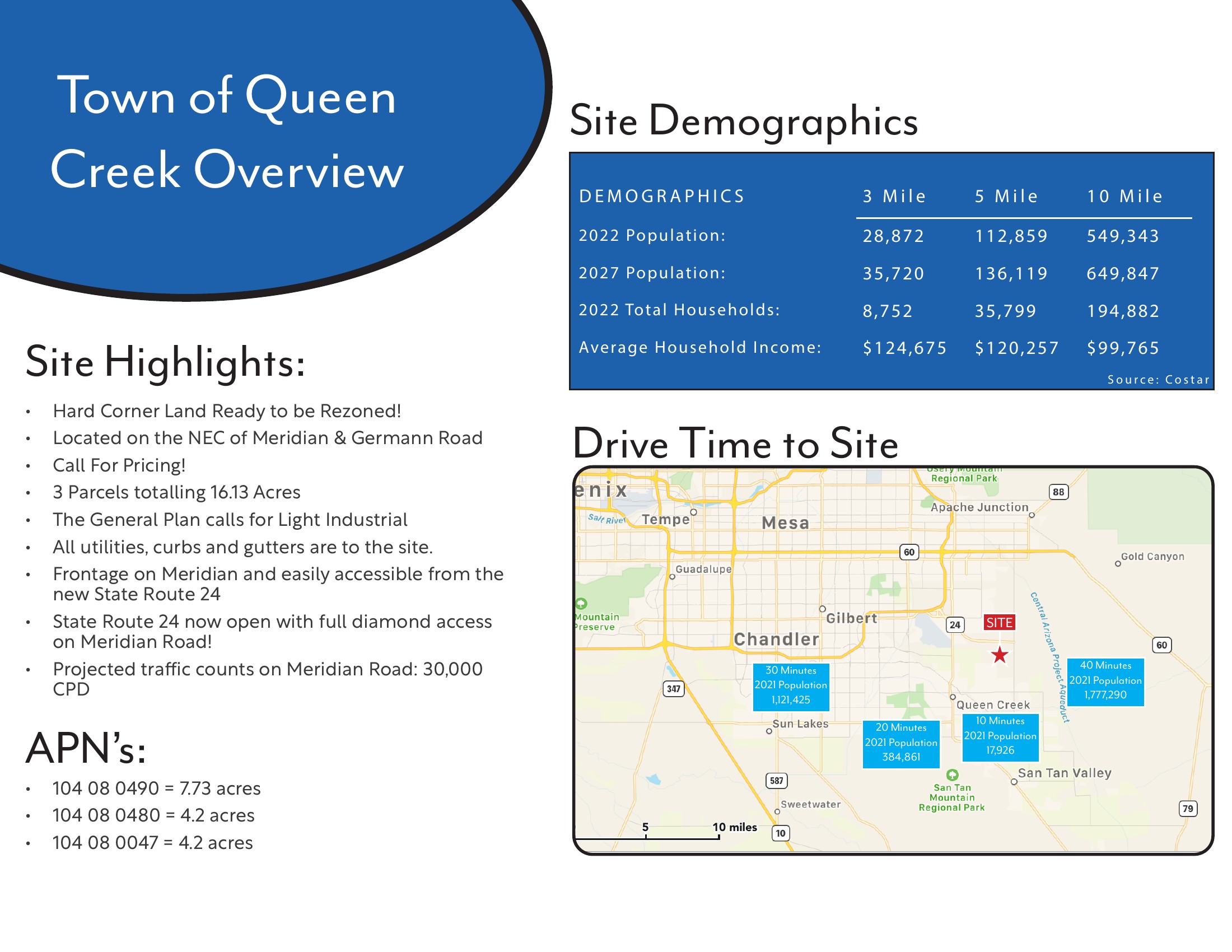 Hard corner land ready to be rezoned at the northeast corner of Meridian and Germann Road in Queen Creek. Three parcels totaling 16.13 acres with the General Plan calling for Light Industrial use. All utilities, curbs, and gutters are to the site. Frontage on Meridian Road with easy accessibility from the new State Route 24, which is now open with full diamond access on Meridian Road. Projected traffic counts on Meridian Road are 30,000 CPD.